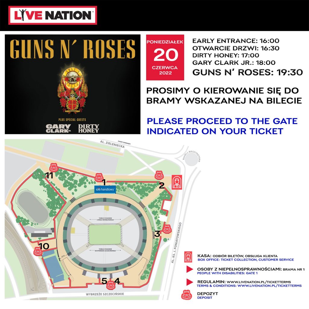 Guns N’ Roses rozpoczną swój koncert o godzinie 19:30. Wcześniej zaprezentują się Dirty Honey (od 17:00) oraz Gary Clark Jr. (od 18:00). Posiadacze biletów „Early Entrance” będą mogli wejść na stadion już o godzinie 16:00, pół godziny później otwarte zostaną wejścia dla pozostałych uczestników.