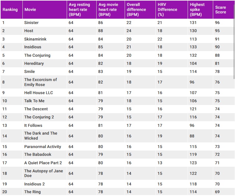 A jaki horror dostał najwyższą notę? W rankingu z 2023 roku okazał się nim film „Sinister” z 2012 roku w reżyserii Scotta Derricksona z Ethanem Hawke’em w roli głównej, który otrzymał aż 96 punktów na 100 w skali strachu. Zaraz za nim znalazł się eksperymentalny film „Host” z 2020 roku, który zdobył 95 punktów. Podium zamknął kanadyjski „Skinamarink” z 2022 roku z oceną 91/100 – kolejna niskobudżetowa sensacja, która zarobiła ponad 2 miliony dolarów przy budżecie zaledwie 15 tysięcy dolarów.