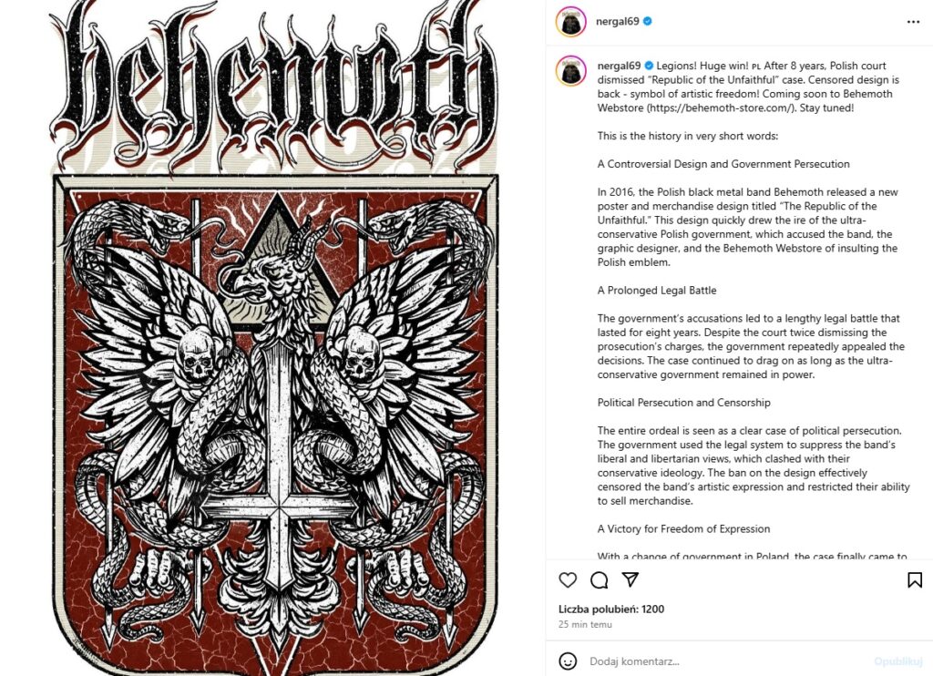 Niedawno podano, że po ośmiu latach prokuratora wycofała oskarżenia przeciwko Nergalowi o znieważenie polskiego godła. Lider Behemotha postanowił wykorzystać ten fakt.