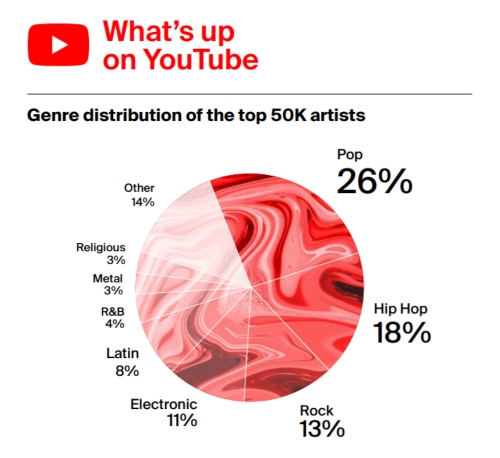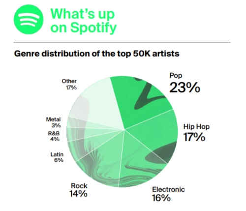 Badanie miało na celu sprawdzić, jak różne gatunki muzyczne reprezentowane są w różnych mediach. Sprawdzono, jaką muzykę gra 50 tysięcy najpopularniejszych artystów. I tak, okazało się, że na Spotify dominuje muzyka popowa (23%), a za nią jest hip hop i elektronika, ale rock uplasował się na czwartym miejscu zagarniając 14% rynku.